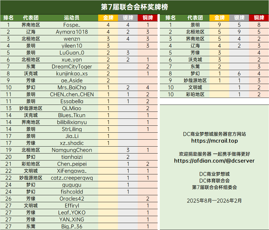 金秋时节,荣耀再续。2025年10月1日至3日,第7届联合会杯秋季赛在生存界各大聚落同步举办。虽然本届秋季赛项目数量相对较少,但仍吸引了20余名玩家热情参赛,共同开展了一场别开生面的竞技盛事。